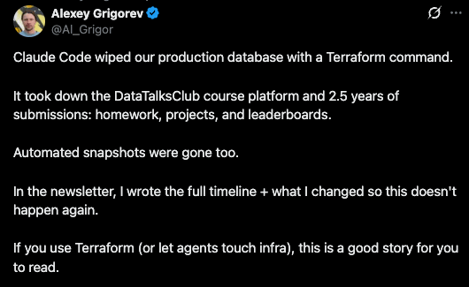 P.S. Grigorev published a full postmortem with the six guardrails he implemented after the incident. One of them was automated daily restore testing: a Lambda function restores from backup every night and verifies the database with read queries. That's the kind of verification step that should exist everywhere an LLM touches production, not just infrastructure. If you wouldn't let an intern run terraform destroy without a review, the same rule applies to the agent.